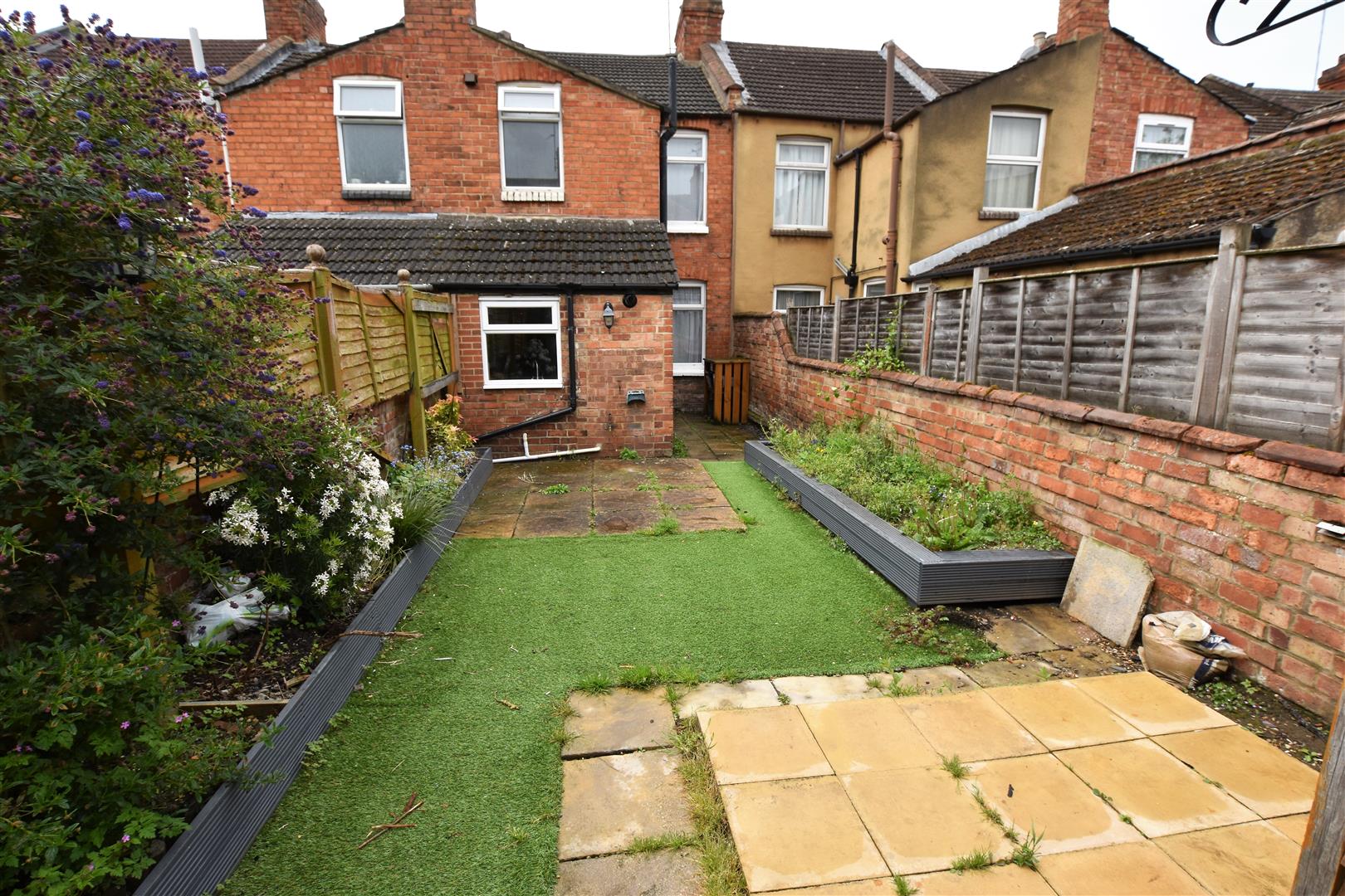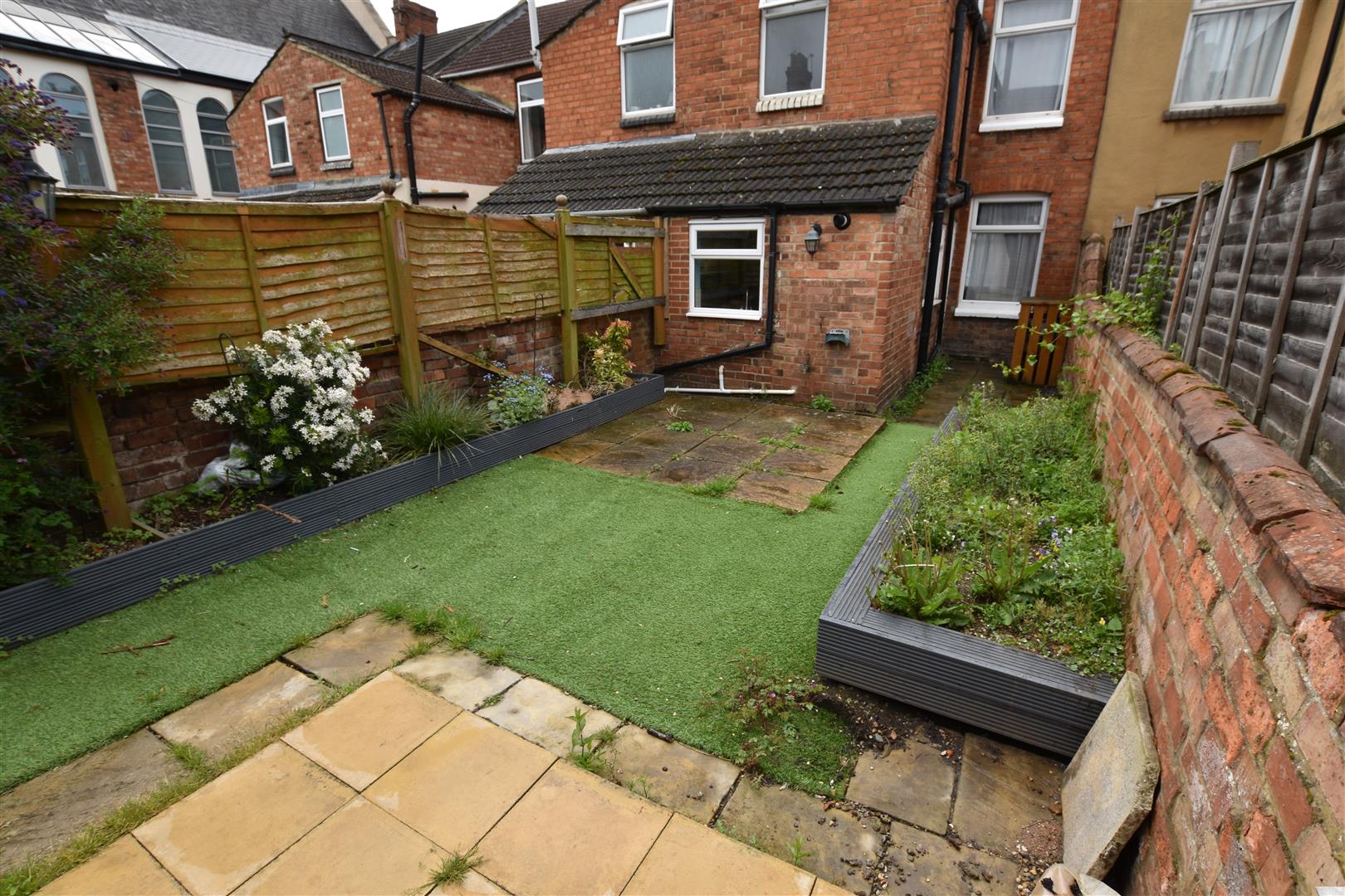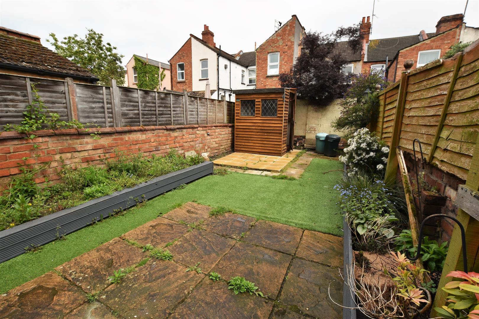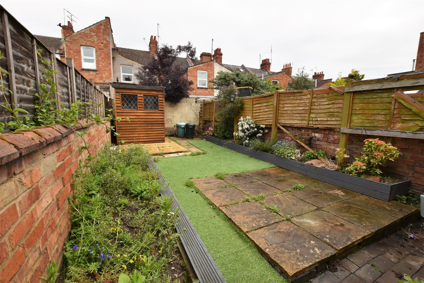 Paved patio to immediate rear with artificial lawn beyond and a further paved area housing timber shed, timber boxed beds with flowers and shrubs, garden enclosed by brick wall and timber fencing.