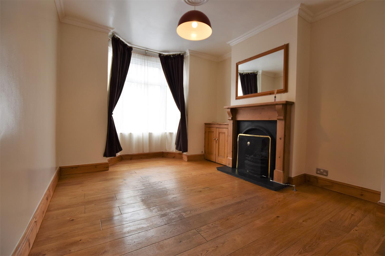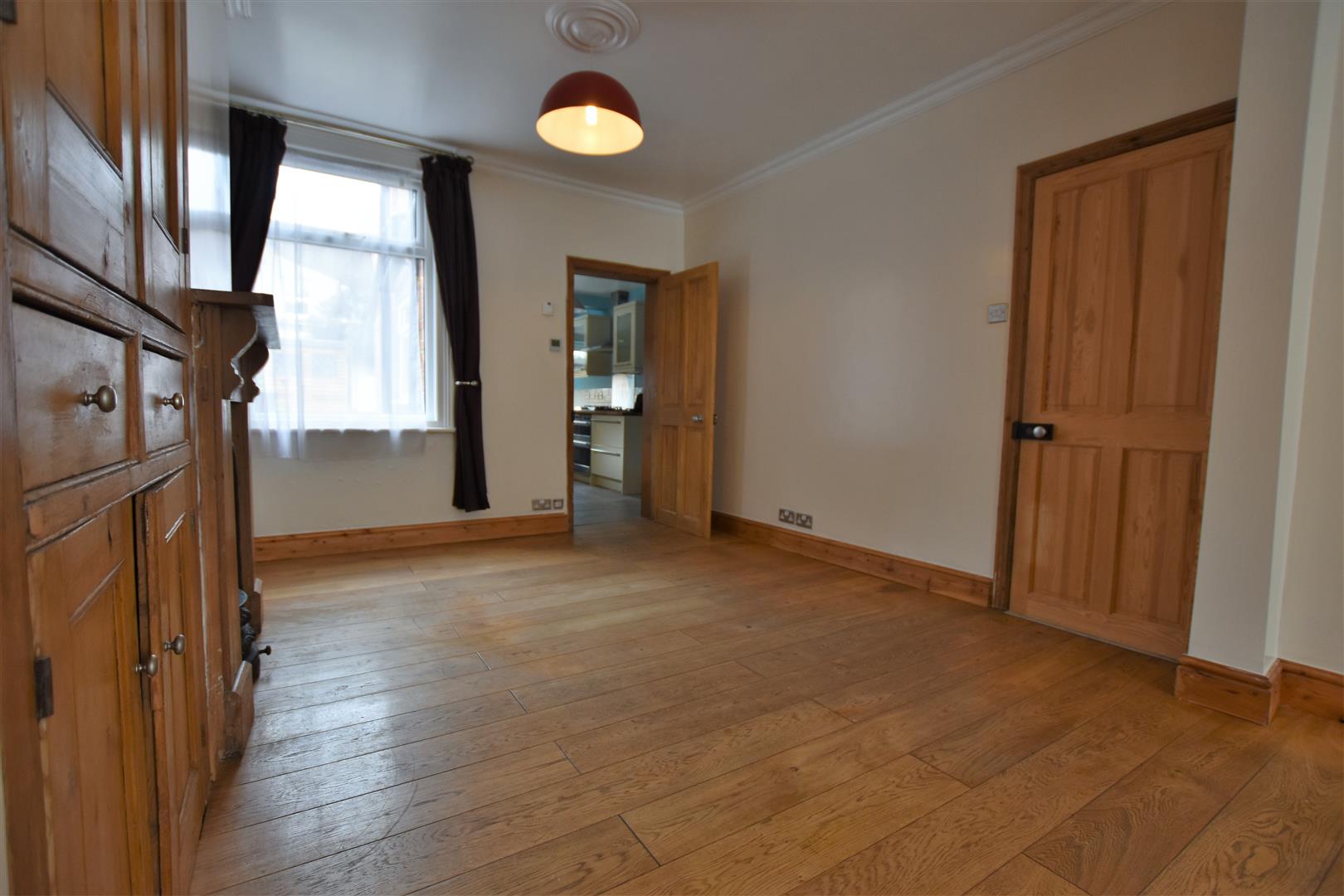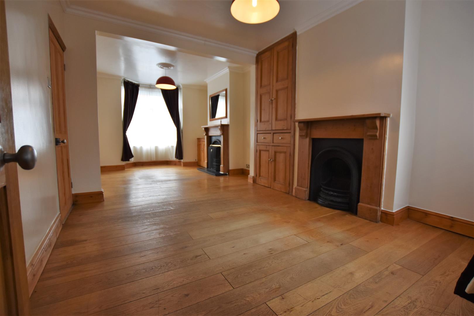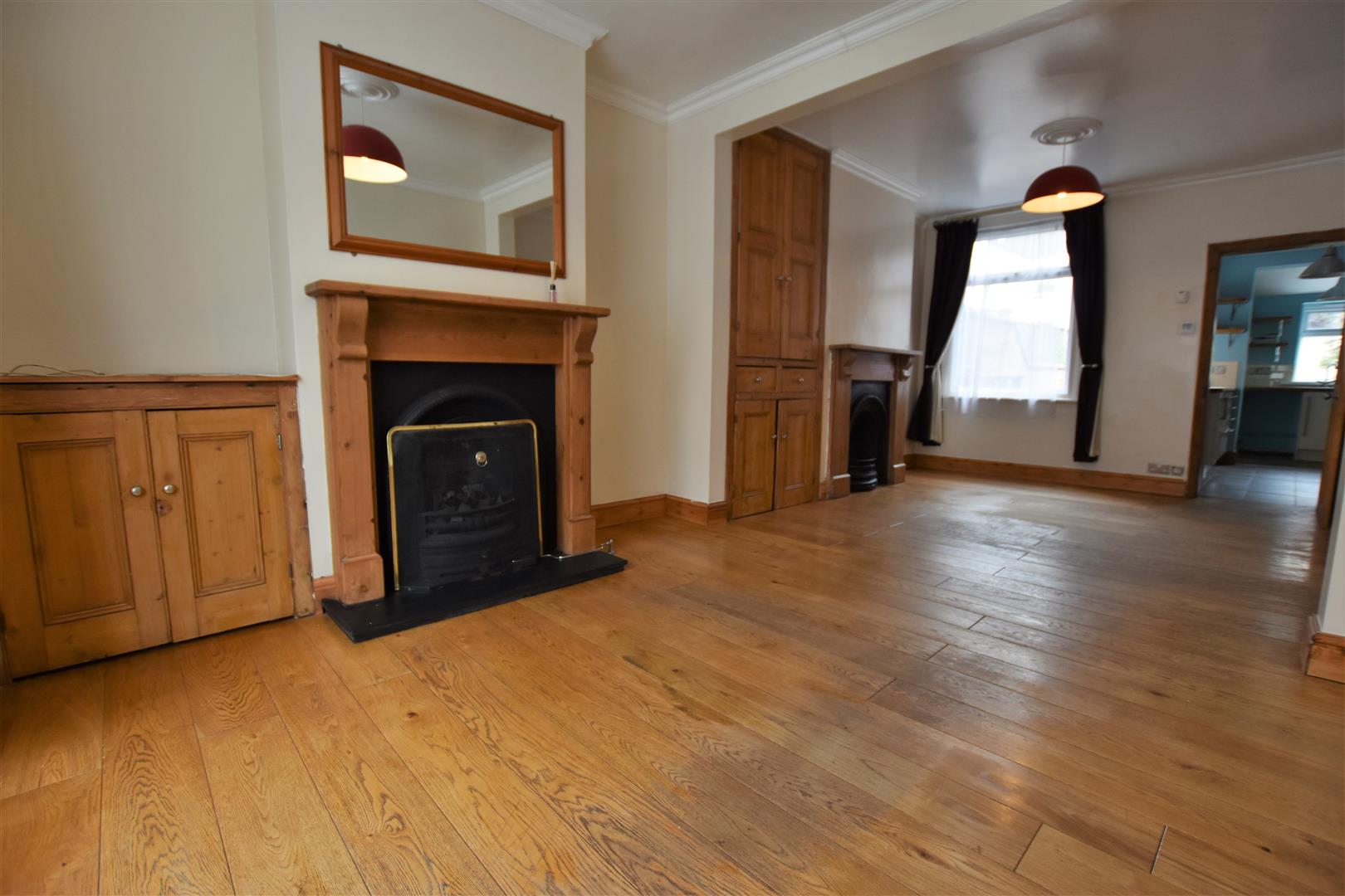 Double glazed bay window to front aspect, double glazed window to rear aspect, two Victorian style cast iron fireplaces with pine surround, one of which has a fitted coal effect gas fire, original built in cupboard to chimney breast recess, coving to ceiling, oak flooring with under floor heating, TV and telephone points, pine door to kitchen.