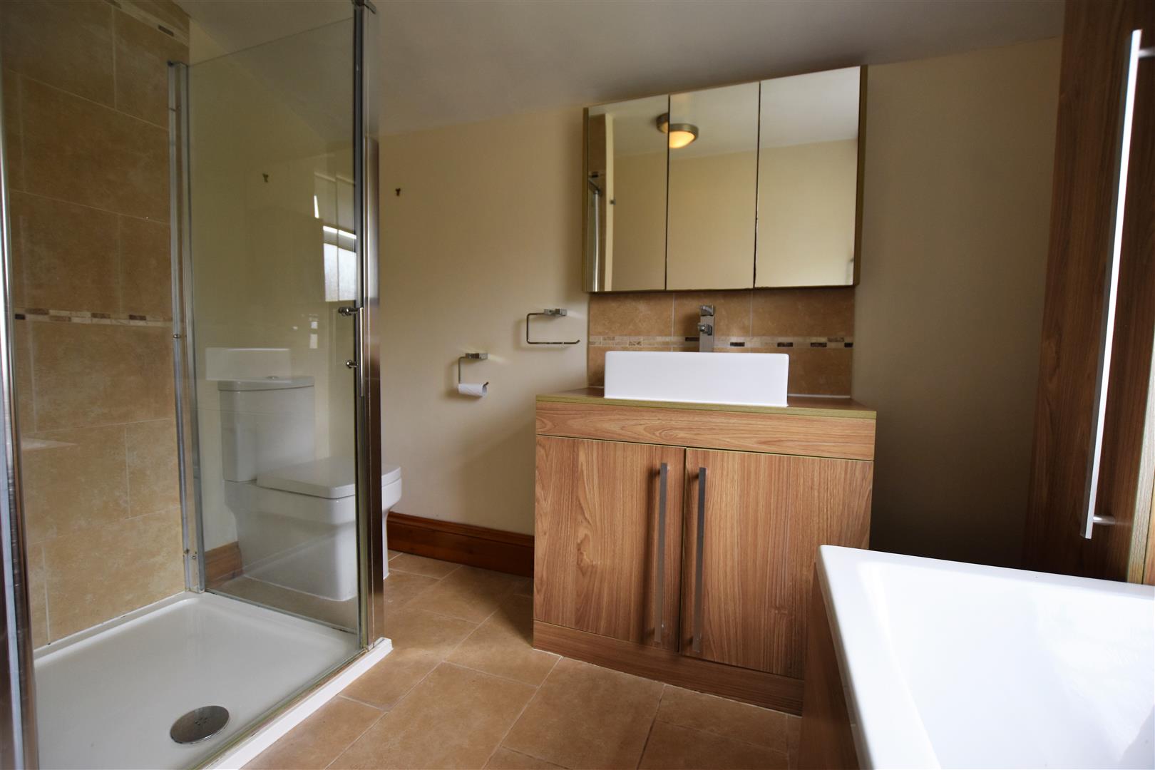 Double glazed window to rear aspect, refitted four piece modern suite comprising of panelled bath with mixer taps, tiled shower cubicle with fitted dual head mains powered shower, sink set in vanity unit and low level W/C, splashback tiling, complimentary tiled flooring with underfloor heating, chrome ladder towel rail.